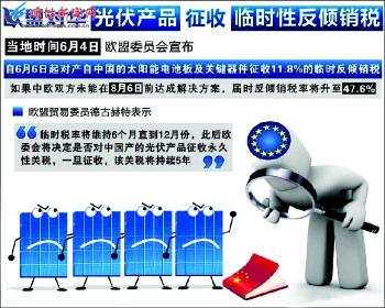 6月4日,欧盟委员会不顾中国反复交涉和多数成员国反对,宣布从6月6日起对中国的光伏产品征收临时反倾销税。欧盟委员会这一明显带有贸易保护主义色彩的举措令中方不满,中方已表示坚决反对。 欧盟委员会称,欧盟拟在头两个月内征收11.8%的税率,两个月的缓冲期结束后,如中欧双方仍未达成妥协方案,反倾销税率将升至47.6%。 自2012年9月启动对华光伏产品“双反调查”以来,欧委会的多次粗暴表现令人失望。去年调查初期,欧委会利用不承认中国市场经济地位、拥有自由裁量权的优势,选取人力成本远远高于中国的美国作为成本参照国,来支持其鼓吹的“中国倾销论”;今年5月底,中方应欧方要求派出代表团去欧盟进行磋商,欧委会却对中方的方案和善意不商量、不解释、不理睬,与欧盟贸易委员德古赫特所声称的“随时准备讨论”形成鲜明对比。 应看到,欧委会此次初裁之所以会留出两个月的缓冲期,并非出于妥善解决中欧贸易摩擦的诚意,而是内外反对呼声高涨所致。在欧盟内部,27个成员国中就有18个国家反对对中国光伏产品征收惩罚关税;6月3日,中国国务院总理李克强在和欧盟委员会主席巴罗佐通话时明确表示,坚决反对贸易保护主义和滥用贸易救济措施,希望双方通过对话磋商解决贸易争端,而不是打贸易战。 中方领导人坦诚和坚决的表态,是为了避免两败俱伤的结果。众所周知,中欧光伏产业早已形成“你中有我,我中有你”的共生格局。根据欧洲研究机构的调查,如一意孤行坚持从速惩罚中国光伏产品,可导致欧洲20多万人失业,经济损失达270多亿欧元(约合353亿美元)。就连一贯强硬的德古赫特4日也不得不坦承,前两个月的低税期就是为了避免欧盟“极为庞大”的光伏产品进口市场受到“干扰”。 欧盟是中国第一大贸易伙伴,中国是欧盟第二大贸易伙伴,双方去年的贸易额高达5460多亿美元。欧委会应该利用未来两个月的缓冲期,改弦易辙,善意回应中方在贸易摩擦中表现出的克制与诚意,尽快通过对话和磋商解决贸易争端,不要做损人不利己之事。 (新华社布鲁塞尔6月4日电) ■ 反响 中方:坚决反对 据新华社北京6月5日电 外交部发言人洪磊5日在例行记者会上表示,欧盟方面执意对中国输欧光伏产品征收不公正的临时关税,中方对此表示坚决反对。 洪磊在回答相关提问时表示,中国政府和有关产业致力于通过对话磋商解决有关问题,体现了极大诚意,做出了巨大努力。中方重视中欧战略合作伙伴关系,致力于维护中欧经贸关系健康稳定发展,希望欧盟方面与中方相向而行,不要采取贸易保护主义措施,否则只会损人不利己。