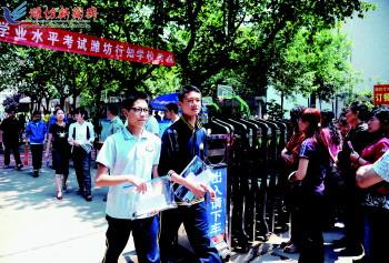 6月12日,在市区行知中学考点,参加完语文考试的考生们走出考场。当日,为期四天的我市初中学业水平考试拉开帷幕。此次考试城区共设11个考点。前三天为初三学生升学考试,最后一天为地理、生物会考。据了解,今年我市将首次实行中考试题全部网上阅卷。 记者曹亮华摄