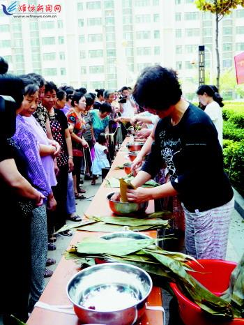 6月11日,奎文区广文街道虞虹桥社区居民在参加包粽子比赛。 当日,该社区的居民们参加了社区“迎端午包粽子比赛”。60余名心灵手巧的大妈们分三组参加比赛,大家卷粽叶、装馅料、扎藤绳、绑粽子,动作娴熟,竞相亮出自己的看家本领。经过一上午的辛勤劳作,社区工作人员将200多个煮熟的粽子分送到辖区内残疾人、孤寡老人、特困户等特殊群体家里,为他们送去节日的关怀和祝福。 记者王立军摄
