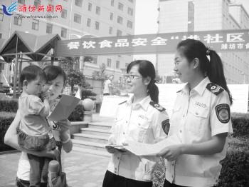 6月16日,潍坊市暨潍城区食品安全“进社区”活动在潍城区北关街道圣泉社区启动。潍城药监分局工作人员以图片和实物的形式,结合实际案例,向居民讲解了餐饮服务食品和保健食品基本法律条款、购进食品的注意事项,以及如何快速辨别食品真伪,受到社区群众的欢迎和好评。图为工作人员现场发放宣传材料。 记者潘来奎 通讯员黄建文摄