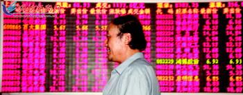 7月11日,在青岛市一证券交易厅,一名男子从股指显示屏前走过。当日,上证综指和深证成指分别收报于2072.99点和8184.77点,较前一交易日收盘分别上涨3.23%和4.25%。