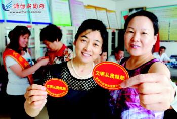近日,在高新区新城街道富华社区居民活动中心,居民正在展示文明标示牌。为积极倡导文明城市创建工作,该社区制作了标有“文明从我做起”的标示牌分发给居民,呼吁他们从小事做起,从自身做起,时时处处做文明人、办文明事。 记者俞珂摄