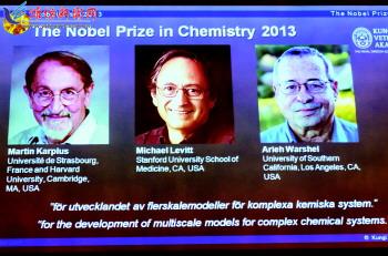 10月9日,在瑞典首都斯德哥尔摩,诺贝尔化学奖揭晓仪式现场播放的幻灯片显示2013年诺贝尔化学奖得主的照片。瑞典皇家科学院9日宣布,将2013年诺贝尔化学奖授予三名美国科学家马丁·卡普拉斯、迈克尔·莱维特和阿里耶·瓦谢勒,以表彰他们在开发多尺度复杂化学系统模型方面所做的贡献。 (新华社发)