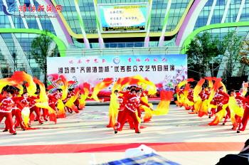 身着火红绸缎裙、手拿彩扇红绸,踩着欢快的节拍,跳起动感的舞步,叔叔阿姨们跳广场舞,同样青春洋溢……潍坊市”十艺节“执委会、市委宣传部、市文化广电新闻出版局主办,市艺术馆与各县市区文化主管部门联合承办的“欢乐十艺节·幸福潍坊人”广场舞大赛于10月11日在市人民广场举行。本次广场舞大赛历时半年,200多支基层舞蹈队伍分别参加了各县市区组织的选拔赛,最终有14支队伍进入决赛。奎文区、潍城区、高新区、青州市等多个市区都派出表演队伍参加角逐,穿着各色表演盛装,打扮亮丽时髦的大赛获奖选手齐聚一堂,为现场观众带来了一台动感十足的广场舞专场表演。不少广场舞爱好者在台下随着音乐与台上的演员齐舞,还有不少周围社区的广场舞爱好来前来观摩学习,手持手机和录像机现场拍摄。 家住奎文区虞河路的陈阿姨刚表演完,就迫不及待地与记者分享三年来跳广场舞的收获。“经常跳舞不仅有利于身体健康,还能减压。最重要的是,以前小区里不认识也从不打交道的街坊,通过跳广场舞渐渐拉近了距离,一下子多了不少朋友。” 10月12日晚,曲艺专场表演又敲起了鼓点,此次曲艺专场是潍坊市艺术馆、潍坊市曲艺家协会继“曲艺进校园”“曲艺进大墙”之后,为活跃我市群众文艺舞台,迎接十艺节胜利召开,开展的又一项以曲艺为主的文化活动。人民广场再一次人头攒动,晚会中,演出节目包括了御版书《玲珑塔》、东路大鼓《张老哥投资记》、相声《杂学唱》、山东快书《抹墙》等类型丰富的节目。近两个小时的节目令观众大饱眼福,掌声、叫好声不断。 市曲艺家协会会员任健与搭档付根表演了一段精彩的数来宝《找幸福》,扎实的功底和强烈的舞台表现力让他们赢得了在场观众的阵阵笑声和叫好声,任健告诉记者,他们的节目为冲击“群星奖”而准备,“群星奖”正是“十艺节”群众创作演出的最高奖项,在多次巡演中累积的现场经验对即将到来的比赛会有很大的帮助。 在潍坊读大学的王琳第一次听到潍坊人表演的曲艺节目,台上的双簧把她逗得前仰后合,“原来潍坊也有这么专业的曲艺演员,而且我听说潍坊也有自己的‘德云社’,只要有时间我一定会去捧场。” 今年以来,市“十艺节”执委会、市委宣传部、文广新局、文联联合组织举办了“喜迎十艺节 唱响中国梦”为主题的系列群众文化活动,在市人民广场设置了主演出会场,每周末举办群众文艺优秀节目展演,以后相关部门还要在社区、学校、部队不断开展相关活动,借助“十艺节”的东风,继续把潍坊的群众文化做大做强。 图①:潍坊曲艺社团“众乐社”成员表演的相声《杂学唱》。 图②:来自安丘的演员正在表演东路大鼓《张老哥投资记》。 图③:精彩的广场舞大赛现场。