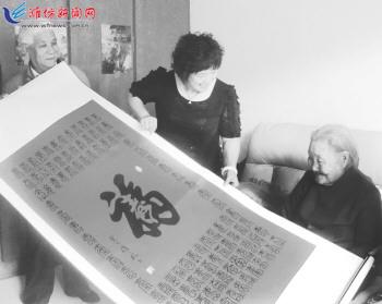 近日,奎文区东关街道新华社区老党员孙维彬为社区95岁的郎益荣老人送来了一幅书法作品。 孙维彬利用两个多月时间,将人们喜闻乐见的诸如“福”、“寿”等字,用艺术的手法创作了10余幅书法作品,送给社区里的老人,祝福老人健康长寿。 记者王立军摄