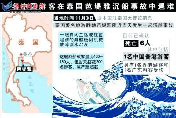 据新华社曼谷11月3日电 (记者常天童 黎藜)据中国驻泰国大使馆3日消息,泰国著名旅游胜地芭堤雅附近海域当天发生一起沉船事故,共造成6人死亡,其中包括一名中国香港籍游客,另有两名中国游客受伤。 中国驻泰国大使馆参赞兼总领事朱伟东接受记者采访说,当地时间3日下午5时30分左右,一艘自阁兰岛驶往芭堤雅的游船疑因机械故障漏水沉没,船上近200名乘客落水。目前已确认有6人死亡,其中包括1名中国香港游客。另有1名香港游客和1名广东游客受伤。 据泰国媒体报道,这艘游船载客量为130至150人,但当天搭载了近200名游客,属严重超载。警方目前正在对运营公司和游船司机进行调查。 又讯 中国外交部发言人洪磊11月4日表示,中国驻泰国使馆将密切跟踪泰国沉船事件搜救工作进展,并已派领事官员到现场了解情况,协助死伤中国公民善后、救治和安置事宜。