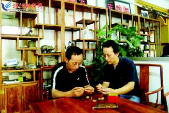 | 史同刚(右)与史同亮一起研究核雕技艺 |