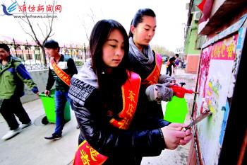 | 图为志愿者在奎文区东庄社区清除墙壁上的小广告。 记者王乐摄 |