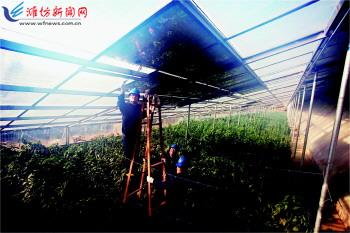 12月11日,稻田供电所的工作人员在太阳能光伏蔬菜大棚内检测线路。当日,寿光首个蔬菜大棚光伏发电项目并网发电,由6800块太阳能电池板组成的17个太阳能蔬菜大棚,年发电量可累计达160万千瓦时。 记者孙树宝摄(新华社发)