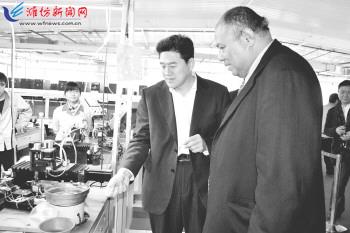 | 昌乐经济开发区积极培育珠宝首饰千亿级产业链,目前宝石城有业户近千家,年交易额400多亿元。图为斐济驻华大使萨拉·泰莱尼参观梦金园珠宝加工车间。