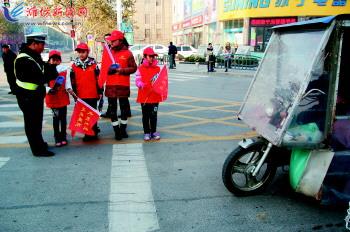 为提高市民交通安全意识和文明交通素质,近日,昌乐交警大队组织部分学生交通志愿者,利用周末时间,协助民警上路执勤,劝导不文明交通行为。图为民警与志愿者共同上岗执勤,发放交通安全宣传材料。 记者刘名顺 通讯员刘涛摄