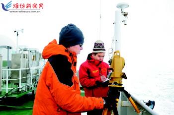 1月5日,中国第30次南极科考队员颜小平(左)和王广东(右)在用“全站仪”监测冰山的位移。当日,在积极设法摆脱困境的同时,“雪龙”号上部分科学考察项目照常进行。目前,船上101名人员安全,物资补给充足。为了保证船舶安全,“雪龙”号在浮冰中开辟了一条长约1公里的“破冰跑道”,等待天气有利时机,破冰突围。另据澳大利亚海事安全局5日早发表最新声明说,该局已要求美国海岸警卫队“北极星”号破冰船前往南极联邦湾,协助救援遭受浮冰围困的中俄两艘科考船。 (新华社发)