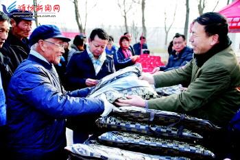 天寒地冻,情暖人心。1月12日,市卫生局、市直机关医院等联合举办的“健康成就中国梦”公益活动走进临朐县蒋峪镇薛庄村,为那里的老党员、风湿病患者进行了义诊,并送去了医药、棉衣、粮油等物资,让他们在寒冬里倍感温暖与关怀。 图为工作人员把棉大衣送到老党员手中。 记者曹亮华摄
