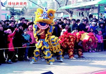 | 春节期间,我市各大旅游景点推出丰富多彩的文化游园活动,吸引了省内外游客前来欢度春节假期。图为游客在富华游乐园观看舞狮表演。 记者王晓光摄