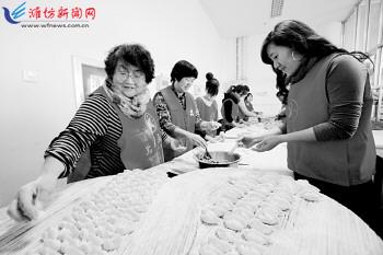 近日,在高新区敬老院,志愿者正在为老人们包水饺。当日,30名鸢都义工和高新区志愿者来到高新区敬老院开展志愿服务,同老人聊天,帮助他们打扫卫生,还为老人们送来了瓜果等慰问品,受到老人们的欢迎。 记者王乐摄