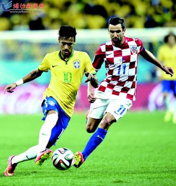6月12日,巴西队球员内马尔(左)与克罗地亚队球员达·斯尔纳拼抢。