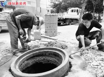 6月17日,在潍城区城关街道岳王庙社区,工作人员正在更换井盖。自教育实践活动开展以来,该社区加大走访力度,深入了解社情民意,本月将小区内的12个下水道井盖逐一修复和牢固,用实际行动践行党的群众路线,给居民营造安全的居住环境,确保社区居民安全出行。 记者王乐摄