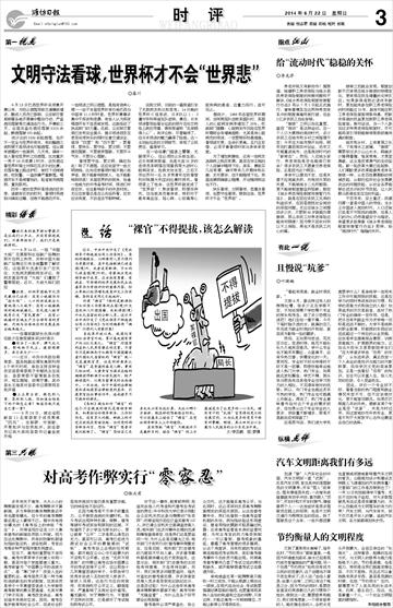 6月13日巴西世界杯足球赛开赛以来,为防止酒驾导致交通事故增多,酿成人员伤亡惨剧,公安部交管局部署各地开展集中整治行动,严查酒后驾驶等交通违法行为。开赛前三天,全国共查处酒后驾驶5200余起、醉酒驾驶570余起。 统计出的5200余起酒驾,也许不一定全与世界杯有关,有的酗酒之徒即便不是球迷也可能酒驾,但从媒体披露的一些案例,几天来,确有一些人看完世界杯之后酒驾,比如重庆一男子16日凌晨2时许,边饮酒边看世界杯瑞士对阵厄瓜多尔的比赛,后驾车撞上路边护栏,被拦下后闹酒疯、咬民警,一查涉嫌严重醉驾。喝酒开车不是闹着玩的,轻者被吊销驾照,重则获刑。 四年一度的世界杯是球迷的狂欢季,谁都有狂欢的权利,看球时用酒助兴确实过瘾,但绝不能酒后开车,一些球迷之所以酒驾,是抱有侥幸心理——由于本届世界杯举办地巴西与中国有11小时时差,世界杯赛事多集中于深夜和凌晨,有些人认为深夜喝酒开车不容易被发现,这就低估了执法部门的力量。此前,公安部交管局已发布安全提示,提示球迷朋友在享受足球快乐的同时注意交通安全,倡导“四要”和“四不要”:要看球、要快乐、要守法、要文明;不要酒后驾驶、不要疲劳驾驶、不要开斗气车、不要分心驾驶。 看球要守法、要文明,确应如此!除了不酒驾,还应该坚守一些文明底线,比如在家看球时能不能小些声音,既不能影响到家人,也不能影响到邻居?本届世界杯的到来,恰逢一些地方的中考备考时间,球迷们半夜狂欢,往往影响孩子的休息时间。无论在家看还是在公共场所看,狂欢应该有度,不妨适当节制呐喊。 说到文明,日前的一篇报道引发了无数网友热议和思考。14日晚的世界杯C组首战,日本队以1:2遭对手科特迪瓦队逆转。赛后,日本球迷冒雨捡看台垃圾的照片在社交网络上疯狂传播,媒体报道称“此举颇得人心”。有评论称,尽管输球了,但日本球迷的魅力赢得了脸面。这一主动捡垃圾的文明细节,体现了公民责任,值得学习。 在一场场豪门盛宴上饕餮,无疑很开心,但必须防止乐极生悲。近日有媒体报道,先是大连51岁的老球员李明强在观看西荷大战时心脏病突发,抢救无效去世,之后又传出苏州一名25岁男青年在收看智利对阵澳大利亚的比赛时猝死。看球搭上了性命,这世界杯就变成了“世界悲”!熬夜看球,即便没猝死,但也极其伤害身体,特别对于患有高血压、冠心病、心绞痛等心脏疾病的患者,应量力而行、适可而止。 据统计,1998年法国世界杯期间,当阿根廷队击败英国队时,英国人的心脏病发病率增加了25%。权威部门提醒:心脏病发作风险在世界杯期间会有增高趋势,尤其是有心脏病史的球迷,一定要做好防患措施。看球诚可贵,生命价更高。且行且珍惜,必须平衡看球时间与身体承受度。 为了增加刺激性,还有一些网友选择网上购买彩票,甚至在非正规的个人店铺中赌球下注。其实,赛前买几注彩票,确可带来几许期待和乐趣,无可厚非,但不能赌球下注。我国法律明确禁止赌博,开设赌球网店也不行。 快乐看球,文明看球,悠着点看球,也要守法看球。做到这些,世界杯才不会“世界悲”。