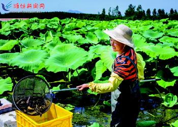 “莲藕池中长,泥鳅水中游”,这是诸城市千亩莲鳅共养生态循环农业发展新模式。这种莲藕和泥鳅共生的生态循环农业发展模式,具有投资少、节水节肥、互生共利、高产高效、美化环境等诸多优点。图为饲养人员在捕捞成鳅。 张晶 徐春光摄