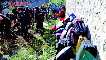 据新华社拉萨8月10日电 (记者杨三军 许万虎)8月9日下午,西藏自治区尼木县境内318国道4740-4741处发生一起特大交通事故,一辆旅游大巴车与迎面开来的一辆越野车、一辆皮卡货车相撞。三辆车共有55人,经全力抢救无效死亡44人,其余11人受伤,正在全力救治,暂无生命危险。 记者9日下午在事故现场看到,事故发生路段位于雅鲁藏布江边的山谷地带,旅游大巴车在撞击后坠入路边深达10余米的悬崖下、雅鲁藏布江边,车轮朝天,车体严重变形。 在救援现场,由武警、公安消防、医务等人员组成的救援队伍携带救援设备,第一时间赶到事故现场奋力抢险救人。但是,由于载人最多的大巴车翻落在陡崖下、雅鲁藏布江边,地形复杂,救援难度很大。 记者从西藏自治区有关部门了解到,事发时,核载55人的大巴车上,共有司乘人员和游客50人,游客分别来自安徽、上海、山东、河北等地;越野车上有4人;皮卡车上有1人。