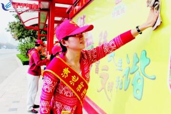高新区将志愿服务作为文明城市创建活动的重要载体,在全区掀起5000余名志愿者积极参与社会服务的热潮。如火如荼的志愿服务活动,提高了创建文明城市的知晓率、支持率,赢得了市民称赞,带动了全社会的积极参与。图为志愿者对辖区部分公交站牌进行卫生清洁。 记者王乐 通讯员马勋 郭雅靖摄