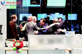 11月12日,科研人员庆祝“菲莱”成功着陆。欧洲航天局12日傍晚确认,欧航局彗星着陆器“菲莱”已成功登陆彗星“丘留莫夫-格拉西缅科”。 (新华社发)