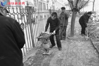 11月21日,施工者在樱园街将路边裸露路面硬化。为助力文明城市创建,有效提升市区形象,奎文区梨园街道樱园社区投资10余万元,将樱园小区老旧楼房公共楼道进行了全面维修并将辖区内裸露地面进行硬化,让小区更安全更美丽,给居民一个整洁舒心的生活环境。 记者尚平摄