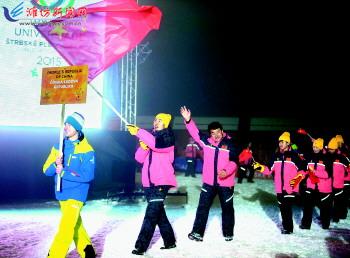 1月24日,中国代表团在开幕式上入场。 当日,第27届世界大学生冬季运动会在斯洛伐克的什特尔布斯凯普莱索开幕。本届大冬会于1月24日至2月14日分别在斯洛伐克和西班牙举行,这也是大冬会历史上首次在两个国家举办。 (新华社发)