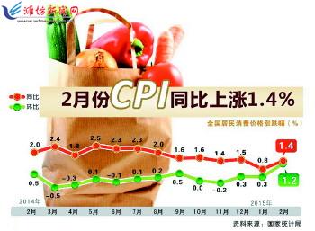 据新华社北京3月10日电 (记者王希 何宗渝)国家统计局10日发布数据,2月份全国居民消费价格总水平(CPI)同比上涨1.4%,环比上涨1.2%,涨幅分别比上月扩大0.6和0.9个百分点。 1至2月平均,全国CPI同比上涨1.1%。据测算,在2月份1.4%的CPI同比涨幅中,去年价格上涨的翘尾因素为零,全部为新涨价因素。 其中,当月食品价格同比上涨2.4%,影响CPI上涨约0.81个百分点。其中,蛋价、鲜菜、鲜果、粮食、肉禽及其制品价格分别上涨11.4%、4.3%、4.1%、2.9%和1.4%,分别影响CPI上涨约0.09、0.16、0.1、0.08和0.1个百分点。 2月份,非食品价格同比上涨0.9%。其中,衣着、医疗保健和个人用品、娱乐教育文化用品及服务、家庭设备用品及维修服务、居住价格分别上涨2.9%、1.9%、1.8%、1.5%和0.6%;交通和通信、烟酒及用品价格分别下降1.7%和0.6%。 10日发布的数据还显示,2月份工业生产者出厂价格指数(PPI)同比下降4.8%,降幅较上月加深0.5个百分点,环比下降0.7%,环比降幅比上月收窄0.4个百分点。