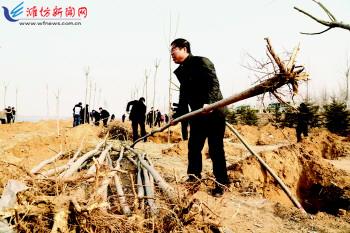 在第37个植树节到来之际,我市以创建国家森林城市为契机,不断加大生态建设力度,坚定不移爱绿植绿护绿,城乡再掀新一轮的造林绿化热潮。3月12日,全市210名机关干部在峡山区潍峡路参加义务植树活动,共栽植馒头柳、竹柳等1300余棵。 记者孙树宝摄