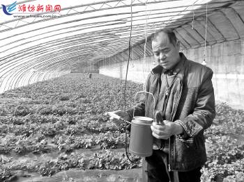 为提高草莓质量,日前,安丘市石埠子镇南王家庄村草莓种植专业合作社社员王培金在大棚草莓园里安装菌罐。近年来,该镇不断推广新品种、新技术,通过安装植物生长灯和植物杀菌罐等新技术,提高了产量,增加了效益和农民收入。 记者尚平 通讯员陈文祥 张瑞摄