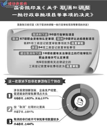 取消和下放90项行政审批项目,取消67项职业资格和认定事项,取消10项评比达标表彰项目将21项工商登记前置审批事项改为后置审批,保留34项工商登记前置审批事项 |