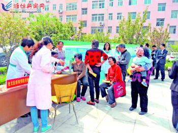 近日,奎文区北海路街道北宫东街社区在怡新苑小区的广场上开展了“健康进社区”活动。来自奎文区疾病预防控制中心的医生为居民进行了测量血压等日常检查,并介绍了常见病的预防知识。医生们向社区居民倡导减盐少油,健康绿色生活方式,还免费发放了油壶和盐勺。此次活动受到了小区居民的热烈欢迎。 记 者刘超 通讯员周见见摄