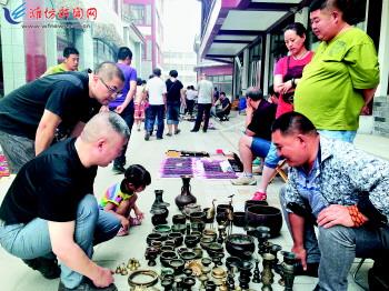 6月27日,潍坊十笏园古玩市场开市,今后,市民又多了一种休闲方式:每周六、周日及农历逢五排十到十笏园古玩市场淘宝。记者在现场看到,字画瓷器、瓦当石像、珠宝珍翠、古旧家具、纸墨笔砚、旧书古籍等包罗万象的各色古香文玩摆满了市场……各大小摊位上展示的藏品门类繁多,吸引了不少古玩爱好者前来“淘宝”。 十笏园古玩市场位于潍坊历史文脉中心——十笏园文化街区,总面积3000余平方米。开市当天,来自我市以及济南、青岛、淄博、烟台等地近万名收藏爱好者及商家齐聚于此,本次开市的十笏园古玩市场将与精品古玩城形成良好的互补,从“小众”走向“大众”,让越来越多的人体验到古玩淘宝的乐趣。 记者陈文文/图
