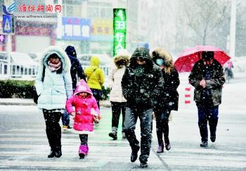本报讯 (记者潘来奎)1月17日是传统的腊八节,一场难得的降雪也将我市气温带入低谷,给人们的出行带来不便。 17日上午,记者在城区潍州路、民生街等路段看到,虽然降雪不大,但是路面上已结了一层薄薄的冰碴,又湿又滑。路上的机动车辆都减速慢行,路边的行人也都小心翼翼,生怕摔倒。市气象台17日9时35分发布道路结冰黄色预警信息,提醒外出市民注意防范积雪或结冰。 记者从市气象局了解到,降雪过后,我市将迎来连续的低温天气。1月18日,内陆地区多云转晴,-2℃到-10℃;北部海区多云转晴,-1℃到-8℃。1月19日,内陆地区晴间多云,0℃到-10℃;北部海区晴间多云,-1℃到-8℃。 上图为1月17日,在市区新华路上,市民行走在雪中。 记者曹亮华摄