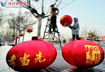 2月2日,在市区东风街上,工作人员正在悬挂大红灯笼。春节临近,市区街头悬挂起一批印有“中国梦”、“孝当先”等文明标语的大红灯笼,在扮靓城市、增添节日气氛的同时,还引导市民文明知礼、向上向善。 记者曹亮华摄
