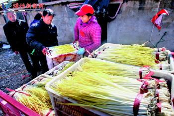 2月2日,安丘张家沙沟村村民在收获蒜黄。日前,安丘市的蒜黄进入收获、销售旺季。 据了解,蒜黄种植原本是安丘市多个乡镇农民在自家菜园、地窖种植的小产业,如今已逐渐发展成了冬闲时节的主要增收项目。 记者孙树宝摄