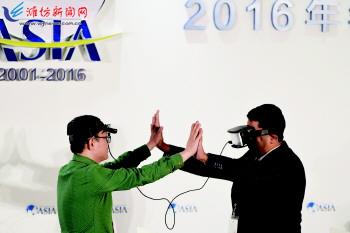 3月24日,蚁视科技创始人覃政(左)同塔塔咨询亚太区总裁吉里什·拉马钱德兰在博鳌亚洲论坛2016年年会“可穿戴设备与智能终端的未来”分论坛上体验VR设备。