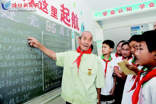 为庆祝中国共产党成立95周年,我市各地通过开展以“学党史、颂党恩”为主题的系列教育活动、重温入党誓词、开展丰富多彩的文艺活动等方式,回顾党的光辉历程,再现英模光辉形象,进一步激发广大党员的荣誉感和使命感,充分展示新形势下人们热爱祖国、热爱党、团结一心、奋发向上的精神风貌。 图①:6月30日,青州市黄楼街道李家庄的八路军老战士李邦立在给小学生讲述党的历史。 记者王晓光摄 图②:“七一”前夕,诸城繁华初级中学党支部组织全校党员前往王尽美烈士纪念馆重温入党誓词。 记者潘来奎 通讯员韩顺摄 图③:6月28日晚,在奎文区广文街道李家社区乐道院附近,演员们载歌载舞,与社区居民共庆建党95周年。 记者俞珂摄