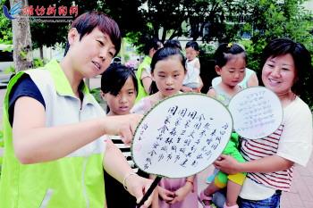 7月5日,在奎文区大虞街道福寿街社区,志愿者正给居民发放带有“四城同创”内容的扇子。为全面做好全国文明城市、国家卫生城市、国家森林城市和国家食品安全城市“四城同创”工作,营造良好的社区环境,该社区将创建四城的标语印在扇子上,给居民送上一份“清凉”的同时,让居民们了解“四城同创”内容,呼吁更多人参与到活动中来。 记者俞珂摄