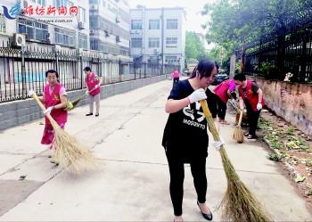 近日,在奎文区大虞街道东庄社区,志愿者正在清扫路面。 为营造干净整洁的社区环境,该社区发动党员与志愿者30余人开展“两学一做”实践活动。他们在炎热天气打扫落叶、积水,清理垃圾,共同美化社区环境。 记者俞珂摄