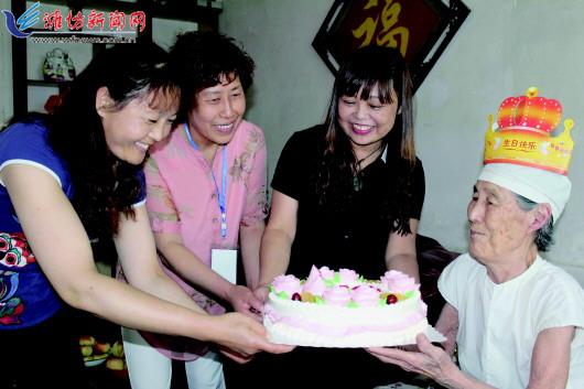 奎文区东关街道李家街社区自为80岁以上老年人庆祝生日以来,每年为社区五十多位老人送上生日祝福,让他们感受到来自社区大家庭的祝福,弘扬了尊老爱老的传统美德。图为近日社区工作人员在给九十五大寿的丁月娥老人送上生日蛋糕。 记者王晓光摄