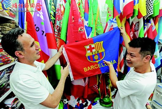 8月3日,马其顿球迷阿夫尼(左)在浙江义乌国际商贸城体育用品市场采购巴塞罗那足球队挂旗。