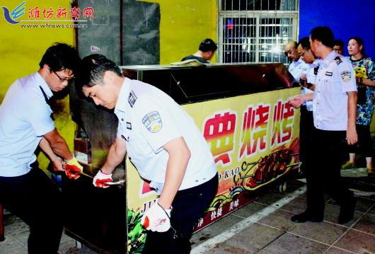 为进一步提升城区空气质量,奎文区成立联合执法队伍在辖区内对露天烧烤餐饮开展集中整治活动,通过采取调整执法力量、调整工作重点、联合执法等方式,进行不间断的集中整治,打造文明和谐、整洁有序的城市环境。8月份先后开展联合执法行动9次,共计出动执法车辆180余台次,出动执法人员700余人次,扣押大、小烧烤炉具90余台,规范烧烤摊点150余家,清理流动摊点、占道经营、乱堆乱放等行为560余处。图为执法人员在查扣露天烧烤炉。 记者王晓光摄