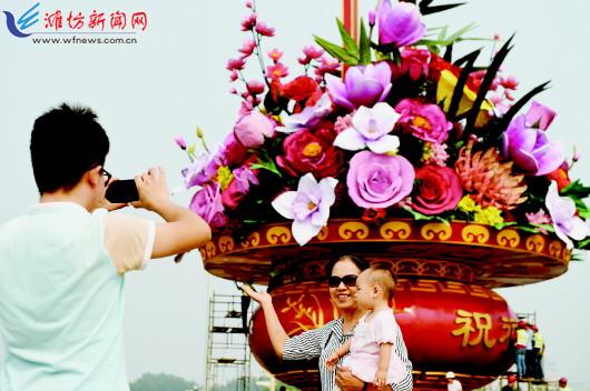 9月24日,游客在北京天安门广场上的“祝福祖国”中心花坛前留影。 为迎接即将到来的国庆节,在北京天安门广场上,主题为“祝福祖国”的中心花坛和其它花坛景观正在紧张布置当中,吸引了来自全国各地的不少游客参观。 (新华社发)