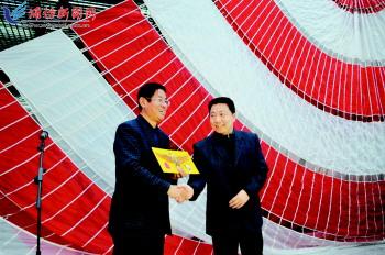 | 图为开舱仪式现场,杨利伟(右)向我市交接遨游太空顺利“回家”的特制潍坊风筝——飞鹰。