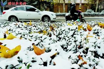 | 11月22日,车辆行驶在雪后的济南街头。自11月21日晚开始,山东大部分地区迎来初雪。 |