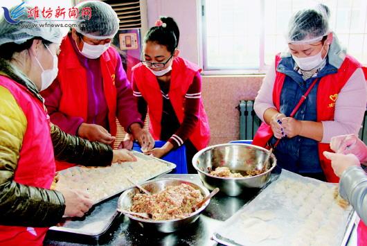 近日,在经济区北城街道,志愿者们正与老人一起包水饺。为进一步弘扬雷锋精神,让福利院的老人度过一个温暖冬天,该街道开展了“牵手夕阳红,温暖老人心”志愿服务活动。志愿者们与300余名老人一起包水饺,其乐融融拉家常,在寒冷冬日给他们送去了温暖,传递了社会正能量。 记者俞珂摄