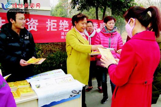 12月7日,寒亭区党员志愿者在给居民发放防范非法集资宣传材料。当日,寒亭街道万春园社区举办“防范金融诈骗宣传进社区”活动,志愿者们发放宣传材料,提高居民防范诈骗的意识。 记者王晓光摄
