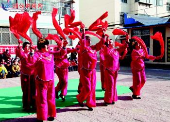 “三八”妇女节来临之际,全市各社区纷纷举办文艺演出活动,丰富社区妇女的文化生活,展示社区女性的风采,弘扬自尊、自爱、自信、自强的精神风貌。图为3月3日,潍城区城关街道岳王庙社区妇女在表演秧歌。 记者王晓光摄